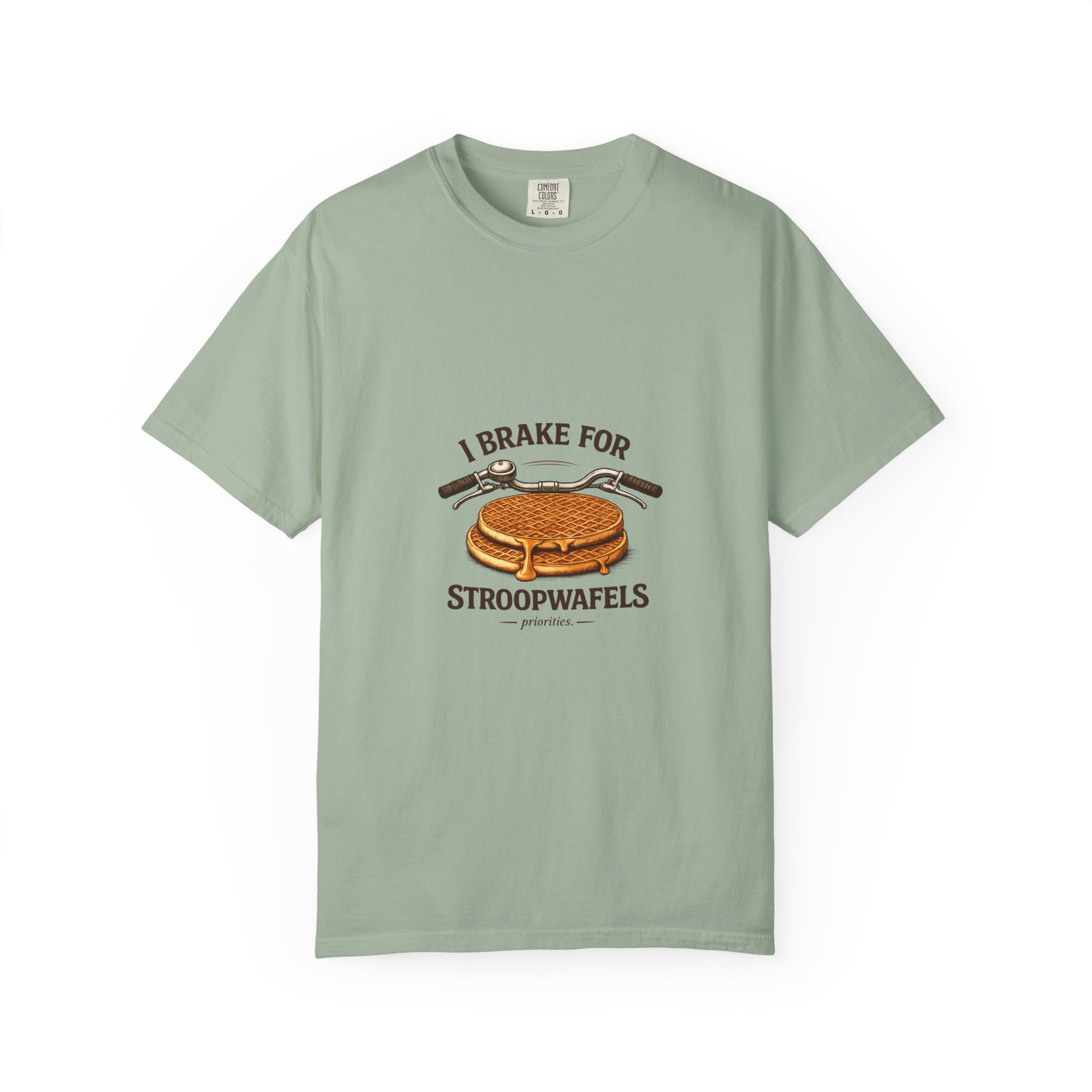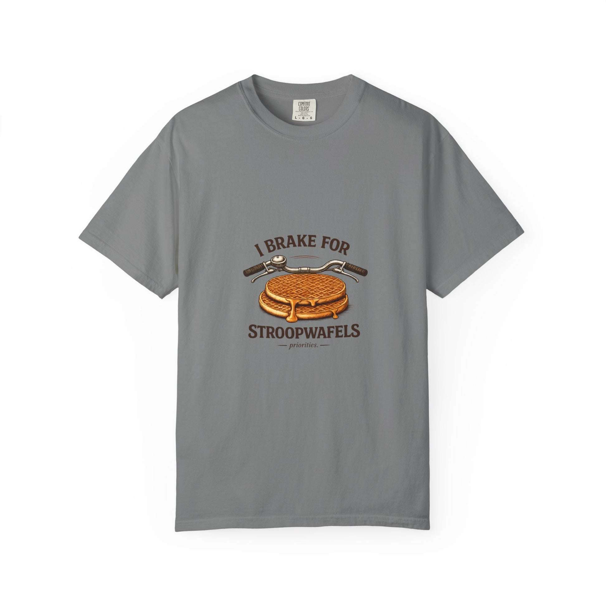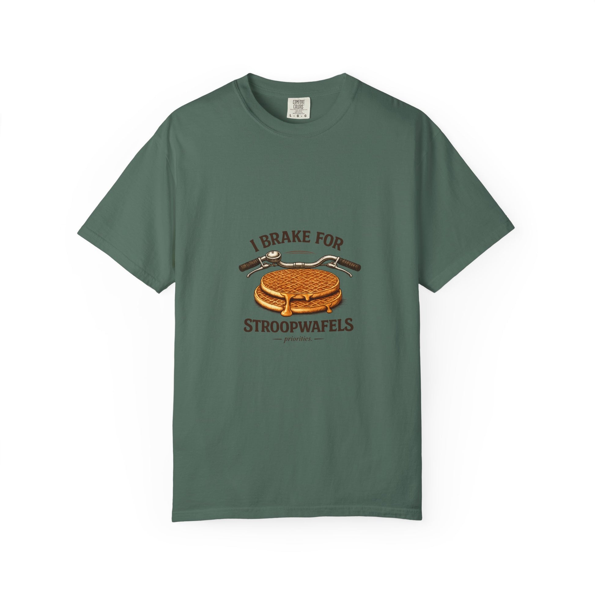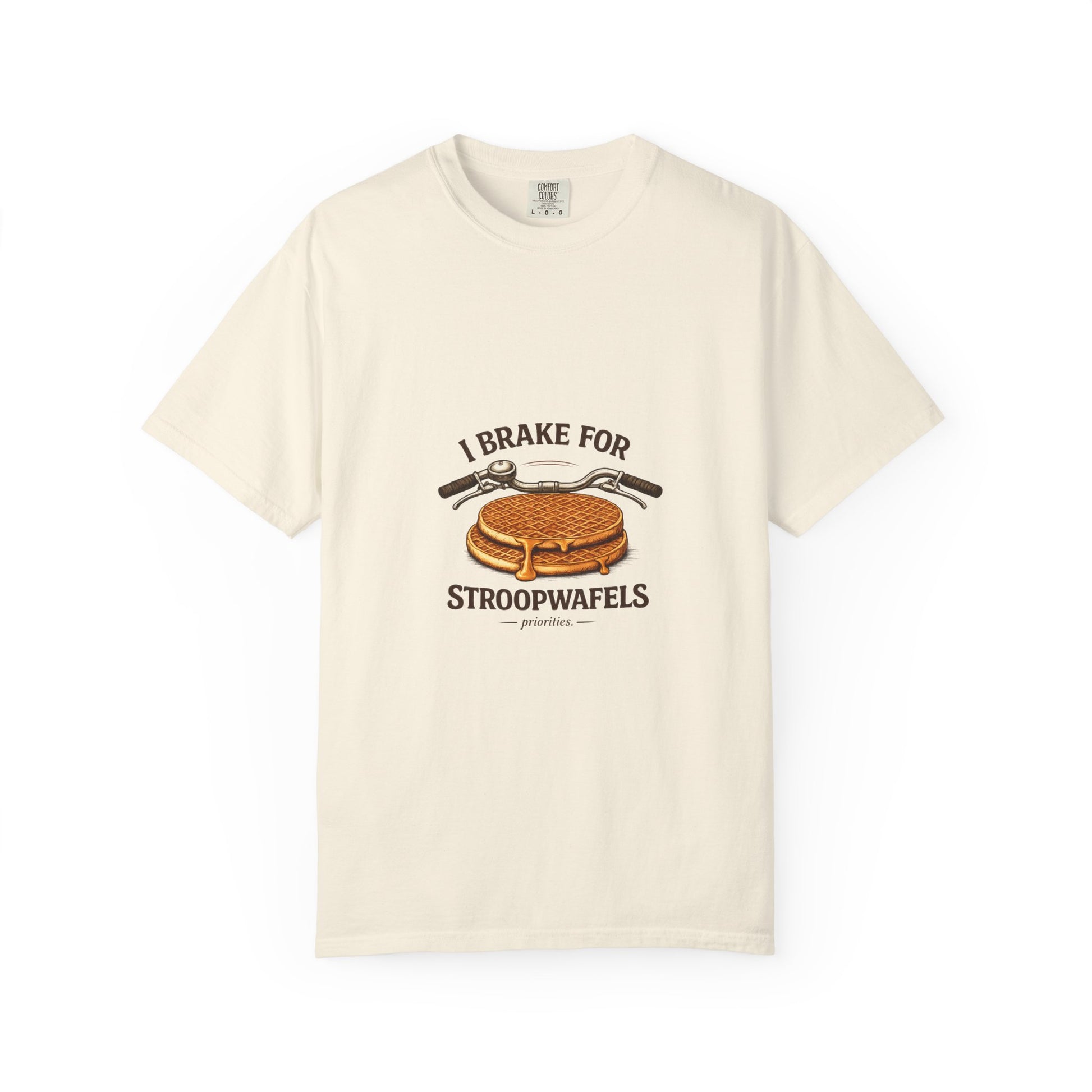 This relaxed, garment-dyed tee brings a little sweet humor to everyday wear. Soft, heavyweight cotton and a relaxed fit make it feel worn-in from the first try. The front artwork — a bicycle handlebar hovering over a crisp stroopwafel and the cheeky slogan “I brake for stroopwafels” — reads like a wink to anyone who loves slow rides, snack stops, and small pleasures. Wear it on weekend coffee runs, bike meetups, or cozy bakery stops; it layers easily under a flannel or stands alone with jeans. The muted, garment-dyed finish gives the graphic a vintage vibe that blends with casual wardrobes and travel-ready outfits. Built to last with double-needle stitching and a tubular knit that keeps lines clean, this is a shirt that travels, pedals, and pauses with you.
