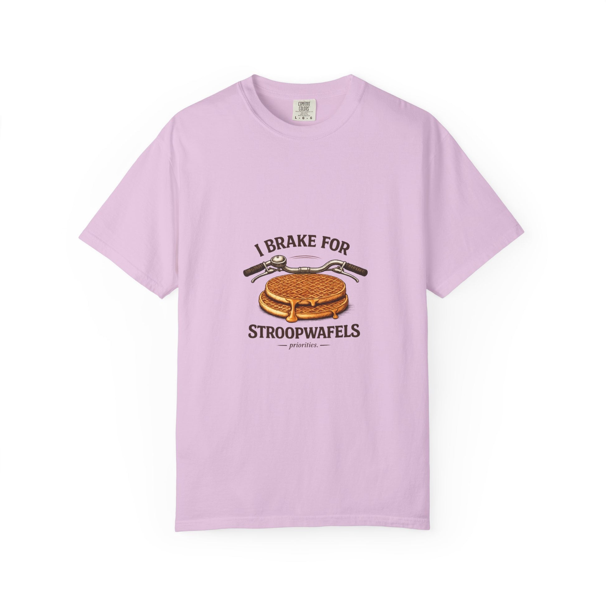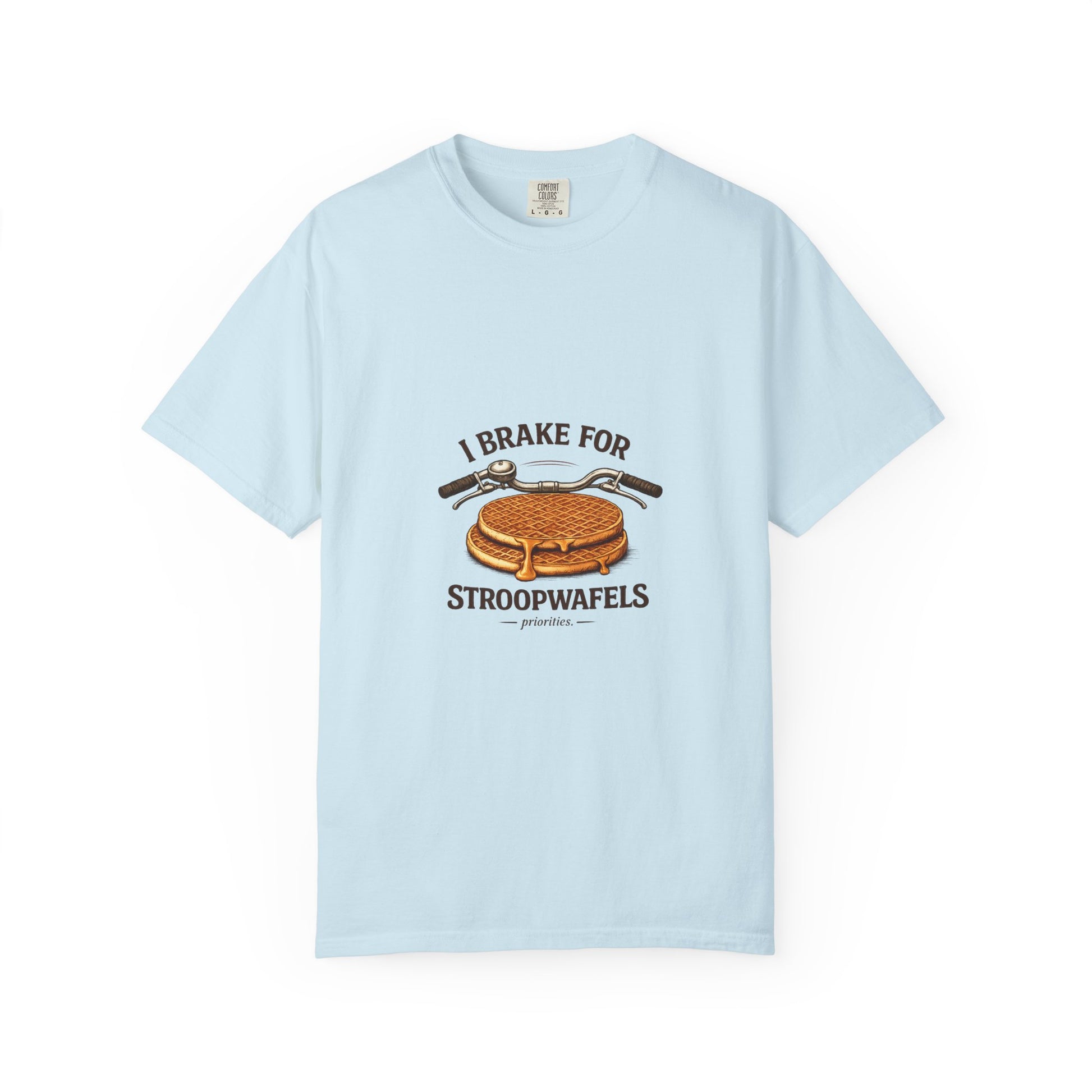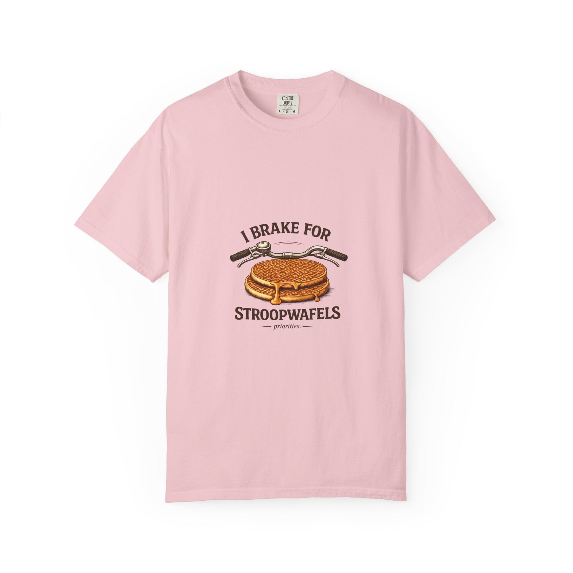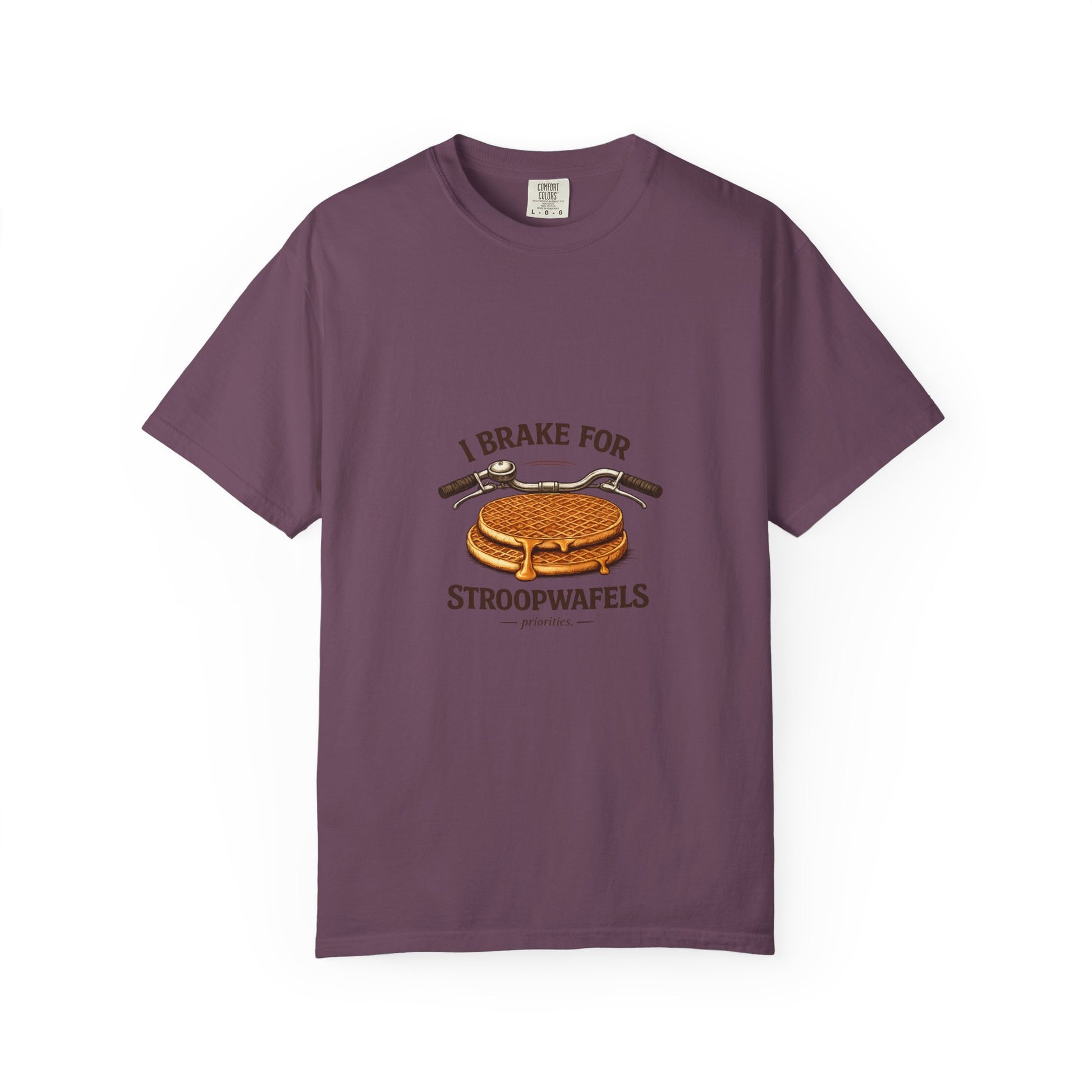 This relaxed, garment-dyed tee brings a little sweet humor to everyday wear. Soft, heavyweight cotton and a relaxed fit make it feel worn-in from the first try. The front artwork — a bicycle handlebar hovering over a crisp stroopwafel and the cheeky slogan “I brake for stroopwafels” — reads like a wink to anyone who loves slow rides, snack stops, and small pleasures. Wear it on weekend coffee runs, bike meetups, or cozy bakery stops; it layers easily under a flannel or stands alone with jeans. The muted, garment-dyed finish gives the graphic a vintage vibe that blends with casual wardrobes and travel-ready outfits. Built to last with double-needle stitching and a tubular knit that keeps lines clean, this is a shirt that travels, pedals, and pauses with you.