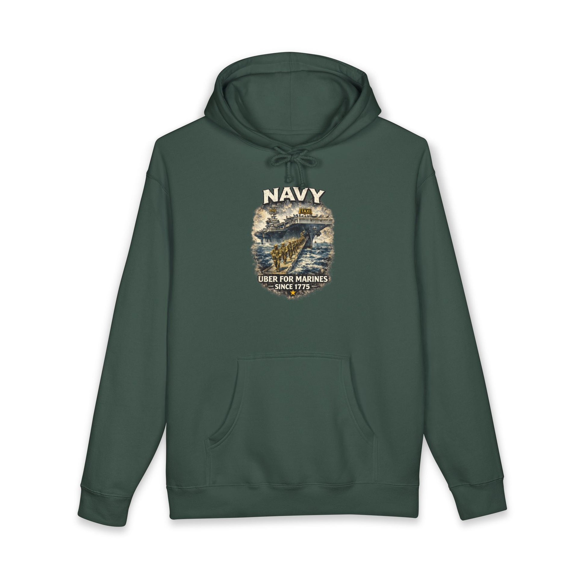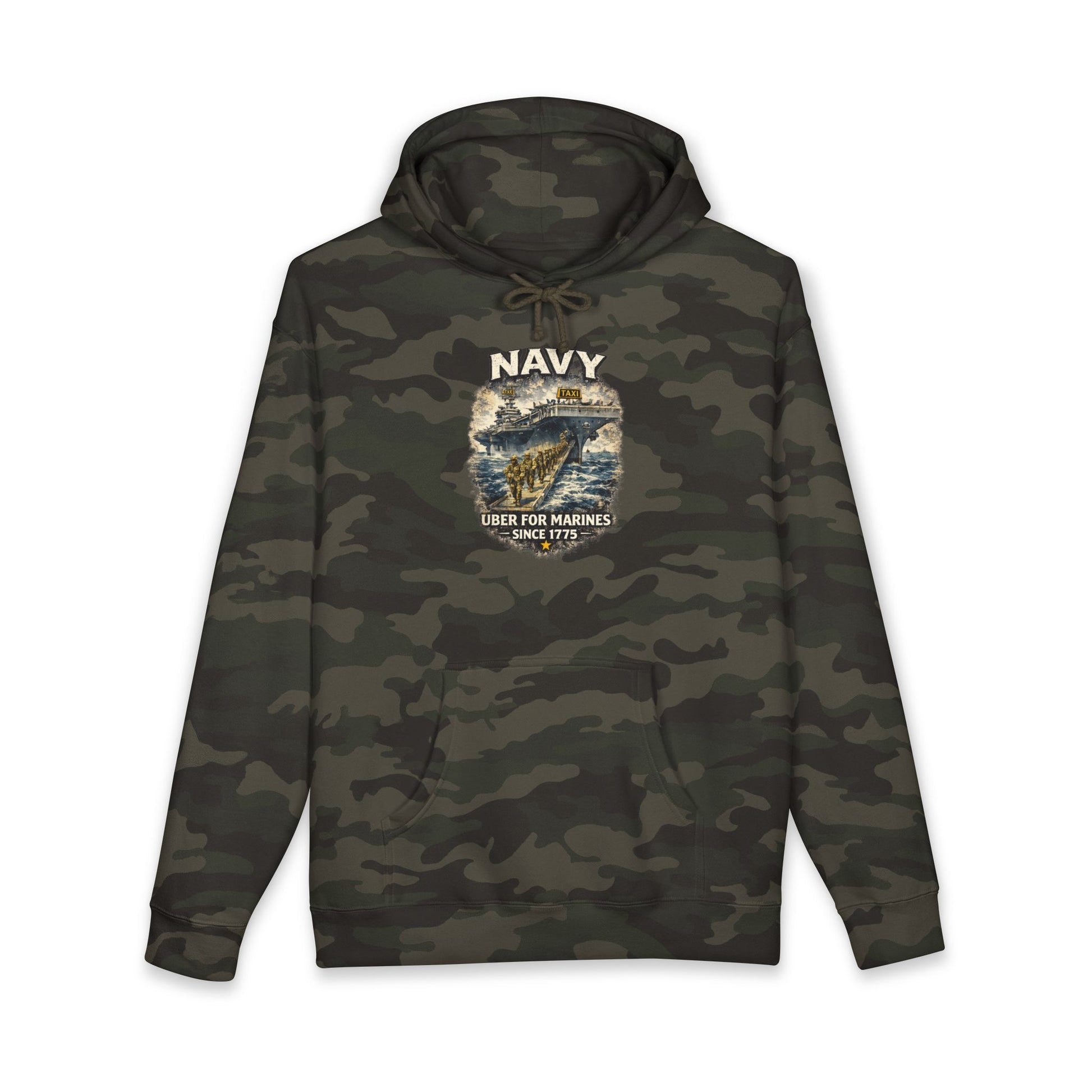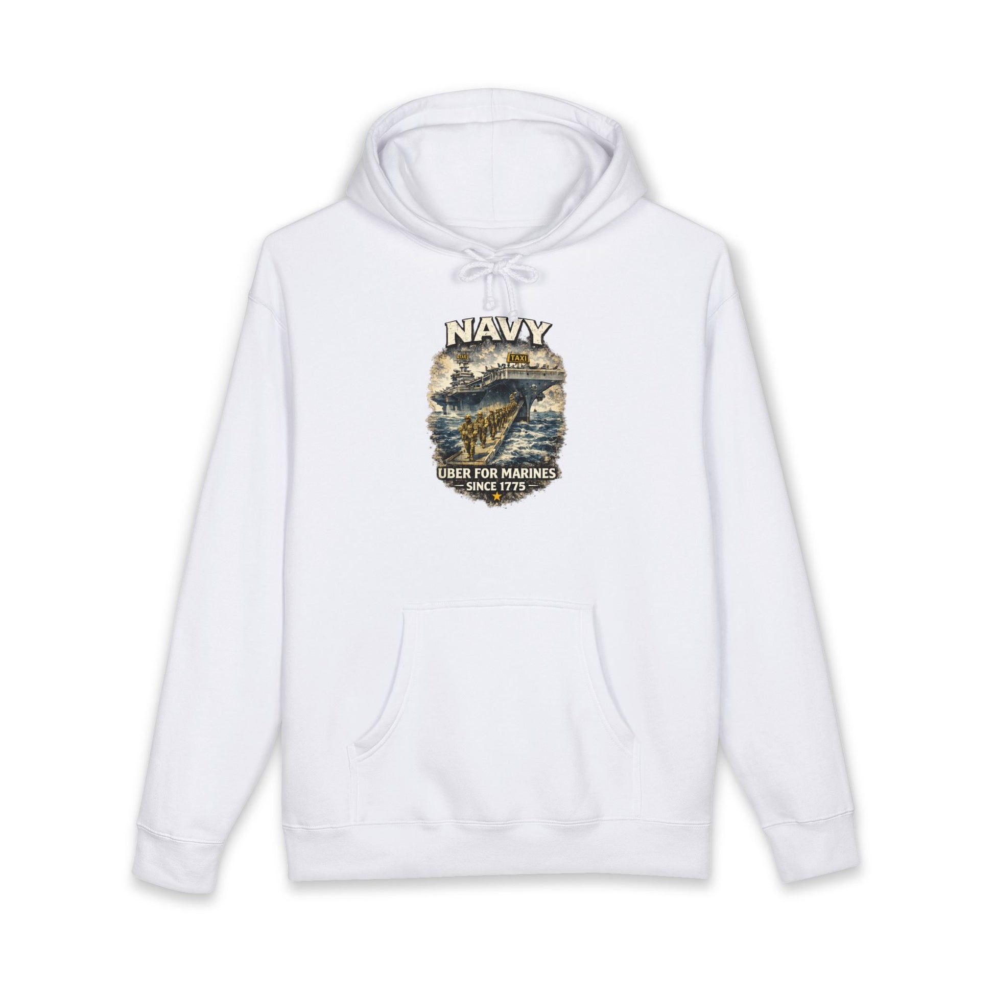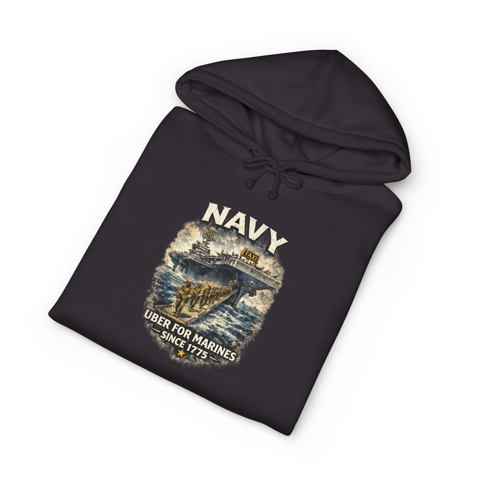 This heavyweight hooded sweatshirt brings a quiet confidence to everyday wear. Thick, cozy fabric and a fleece-lined hood wrap you in warmth on early mornings and late-night runs. The front features a detailed Navy-themed crest that nods to sea stories and long horizons — worn-in and steady, like the people who choose it. Keep it over a tee for layered comfort, pull up the hood when the wind comes off the water, or wear it around the house while you map out the next trip. It feels substantial, dependable, and made to move with you.