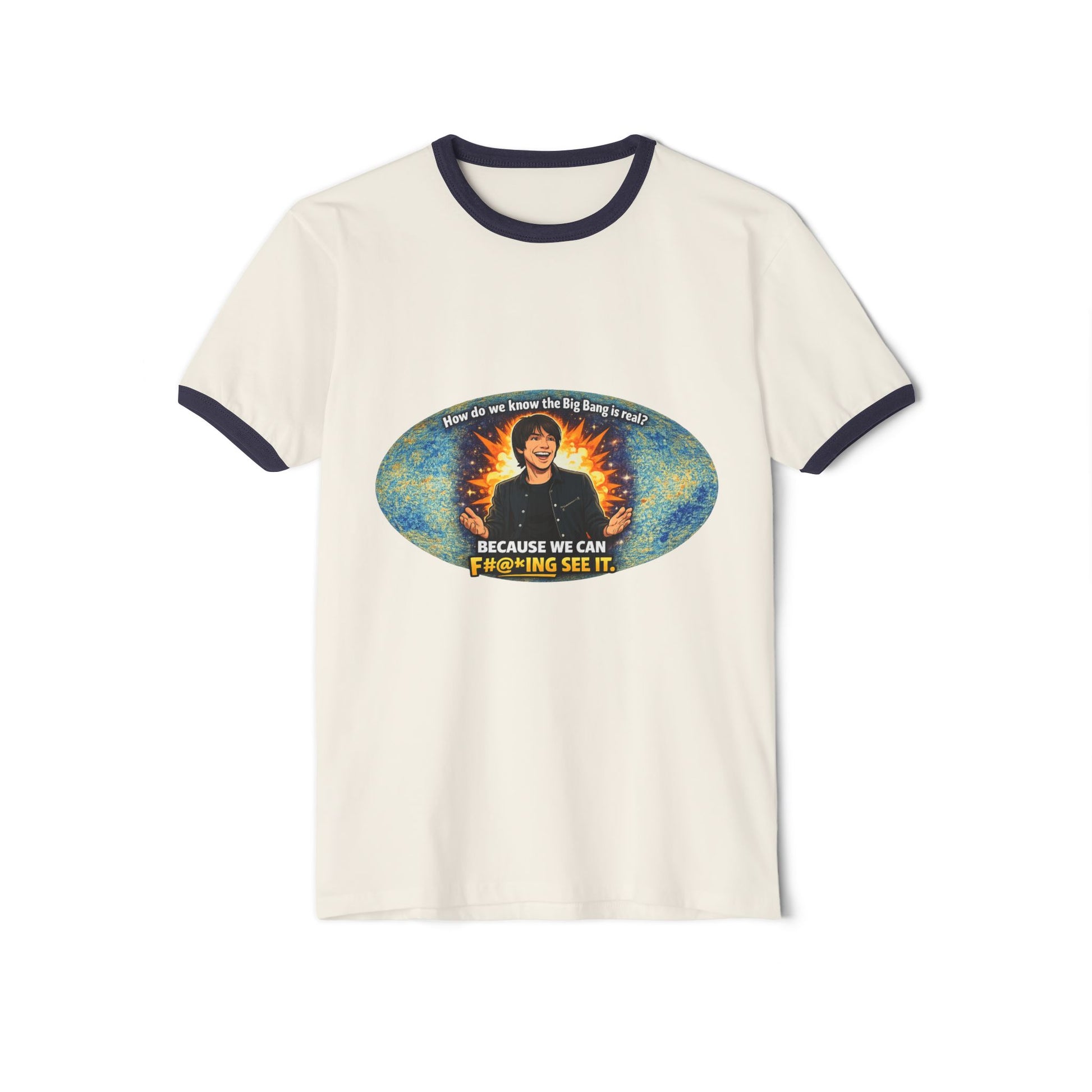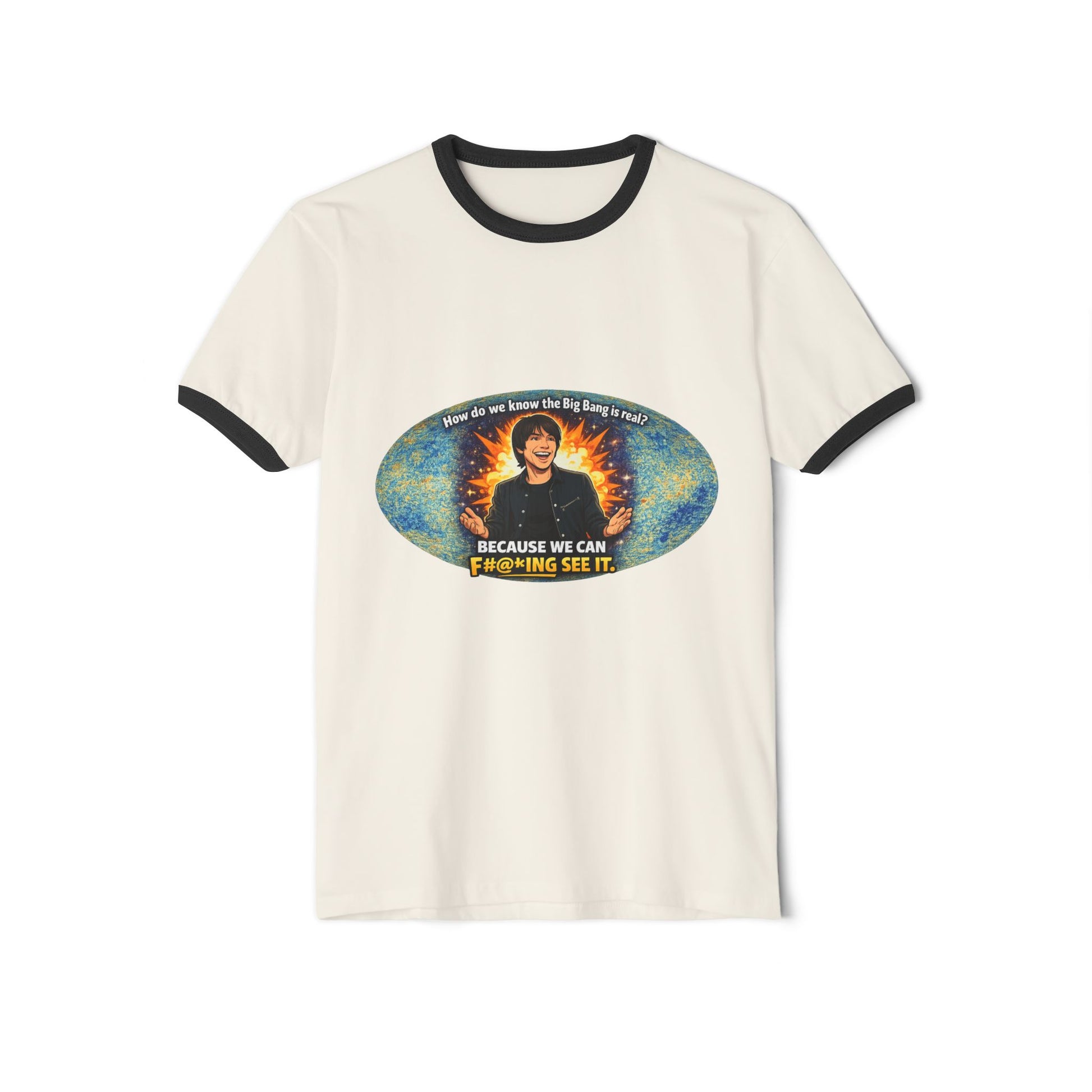 This lightweight ringer tee brings a playful, retro energy to everyday wear. The contrasting collar and sleeve bands frame the chest artwork, drawing the eye to the vivid, slightly nostalgic print. Soft, combed ring-spun cotton feels gentle against skin while the classic fit and side seams keep the tee looking clean and structured through wear. It’s the kind of shirt you reach for when you want casual comfort with a bit of personality — great for relaxed weekends, low-key hangouts, or layering under a jacket for an offbeat touch.