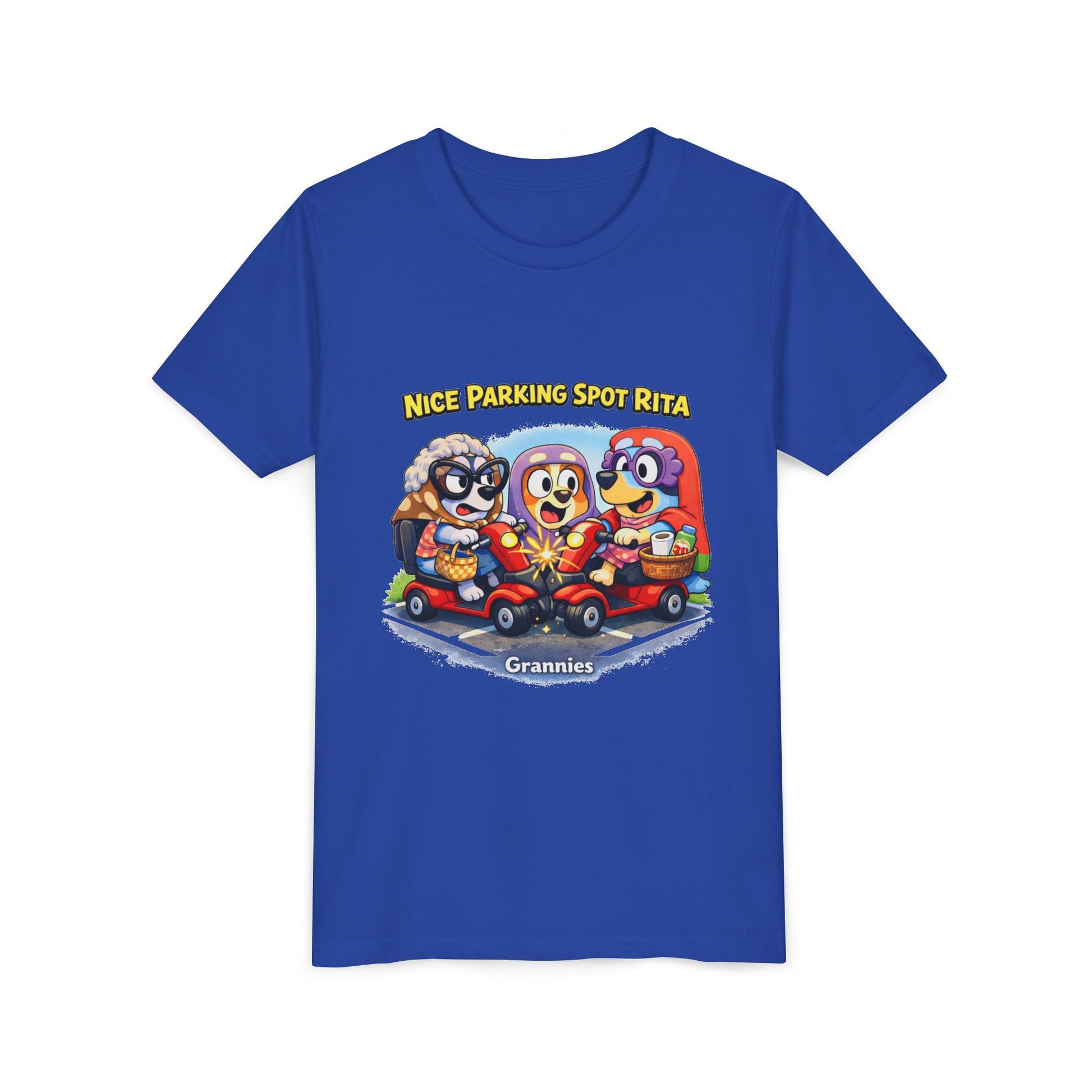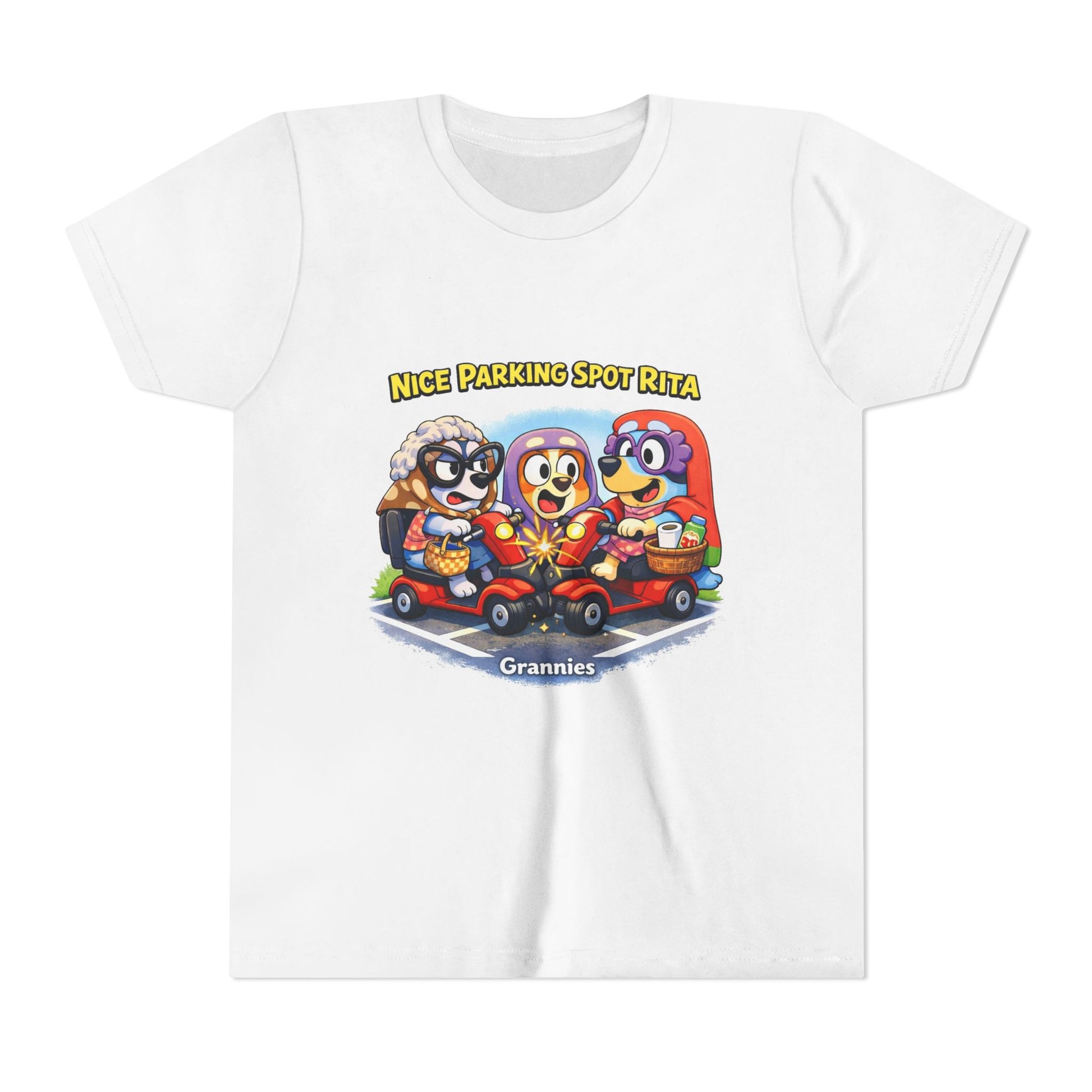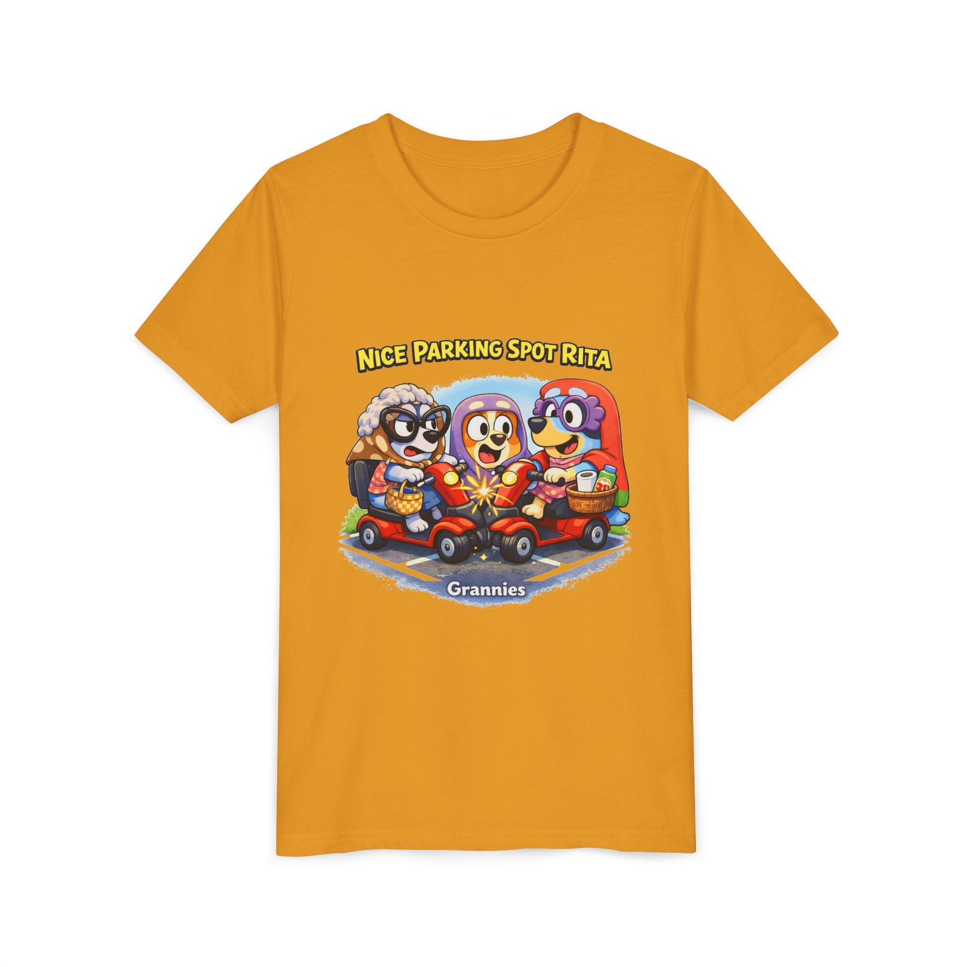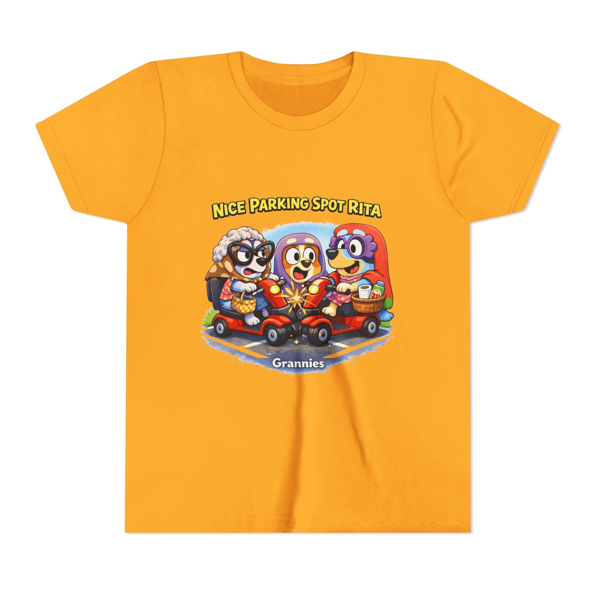 Bright, playful, and a little bit cheeky — this youth tee brings cartoon-style fun to everyday wear. A colorful illustration of three feisty grannies tooling around in mobility scooters is printed on a soft, lightweight crew shirt. The image pops with bold lines and warm colors, and the short sleeve silhouette keeps movement easy for active kids. Wear it to school, weekend outings, or family gatherings where a little humor and personality are welcome. Breathable fabric and a retail fit keep the tee comfortable during play, while the ribbed collar and side seams help it hold shape through washes. It’s a simple way for kids to show off a playful sense of humor and stand out with a vintage-inspired, comic vibe.