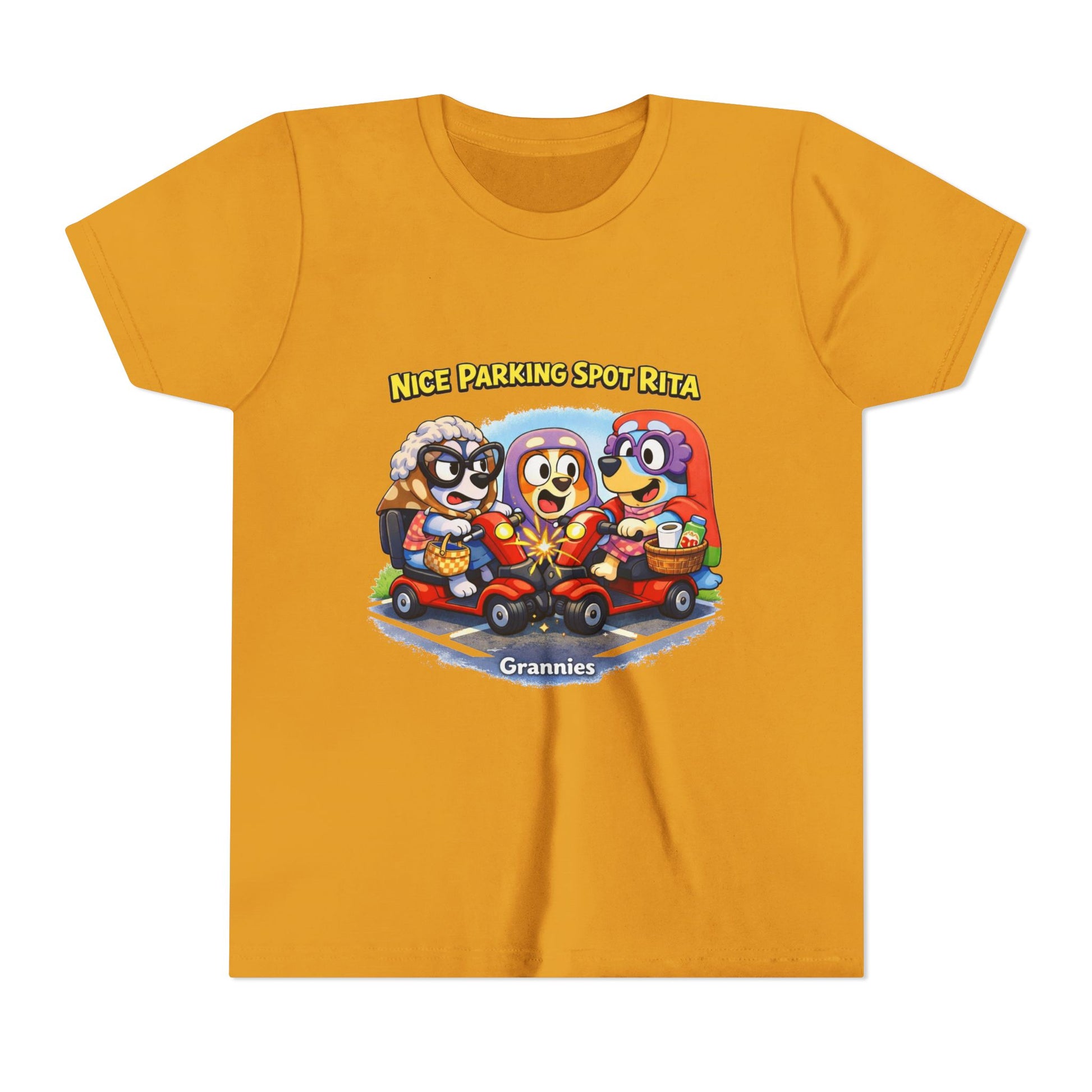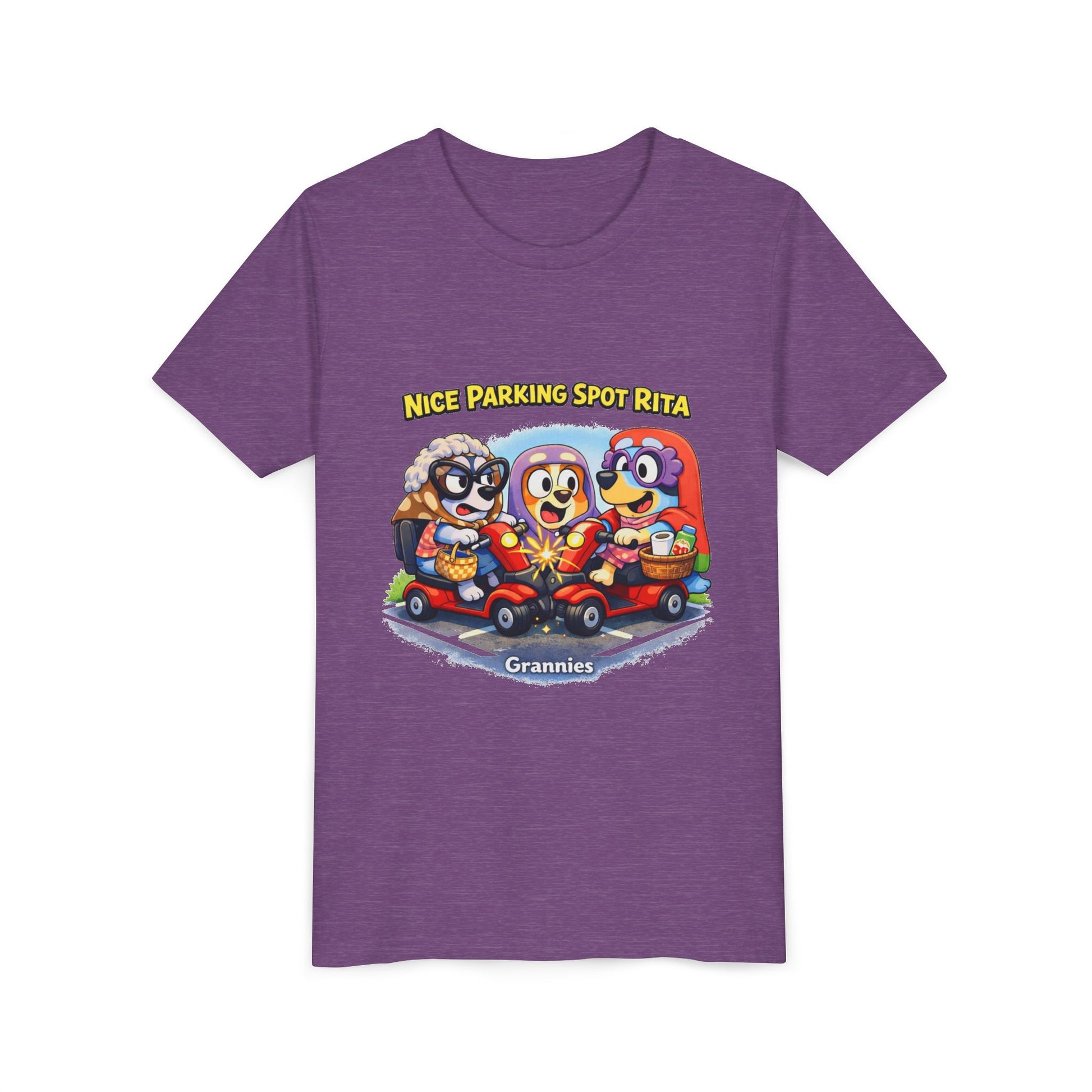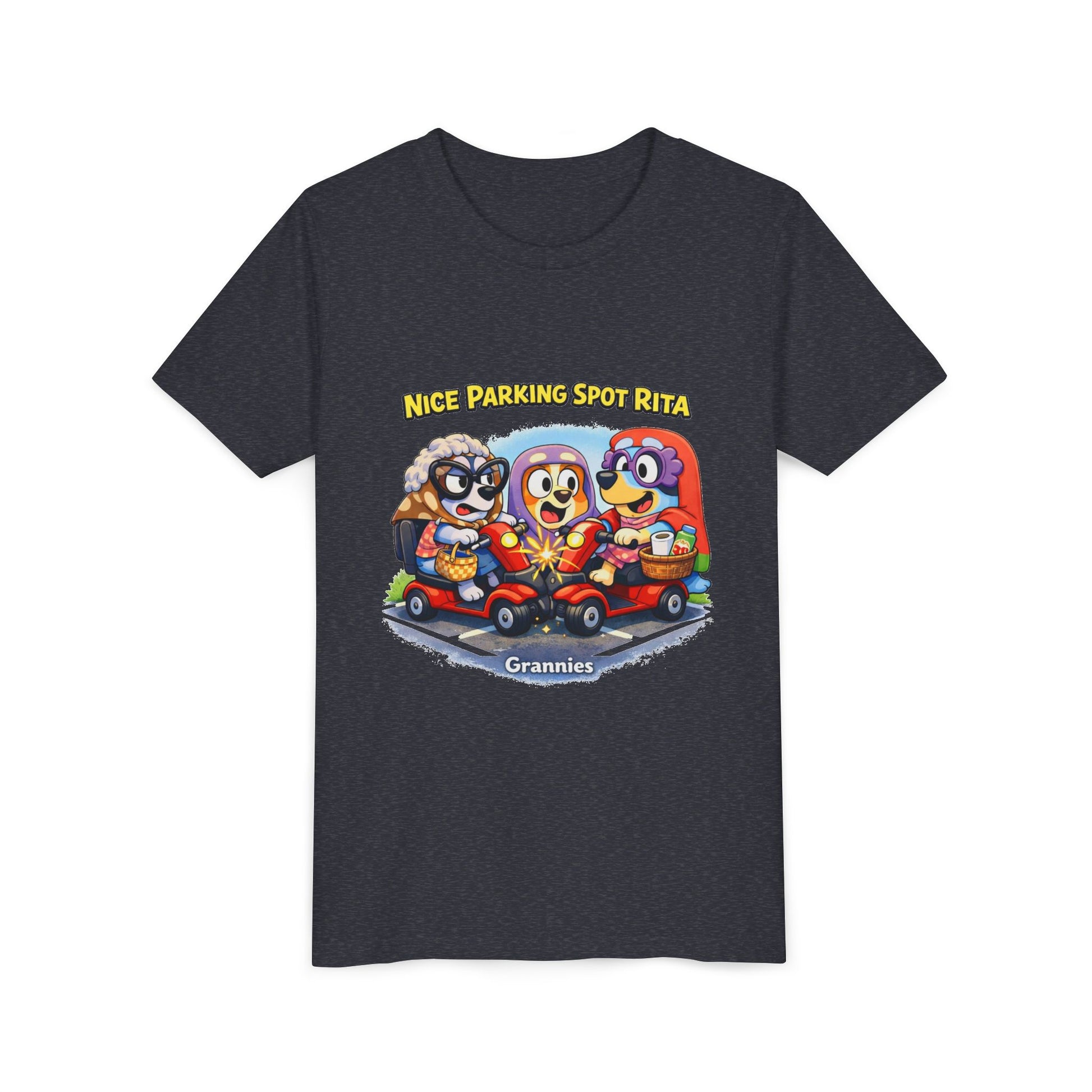 Bright, playful, and a little bit cheeky — this youth tee brings cartoon-style fun to everyday wear. A colorful illustration of three feisty grannies tooling around in mobility scooters is printed on a soft, lightweight crew shirt. The image pops with bold lines and warm colors, and the short sleeve silhouette keeps movement easy for active kids. Wear it to school, weekend outings, or family gatherings where a little humor and personality are welcome. Breathable fabric and a retail fit keep the tee comfortable during play, while the ribbed collar and side seams help it hold shape through washes. It’s a simple way for kids to show off a playful sense of humor and stand out with a vintage-inspired, comic vibe.
