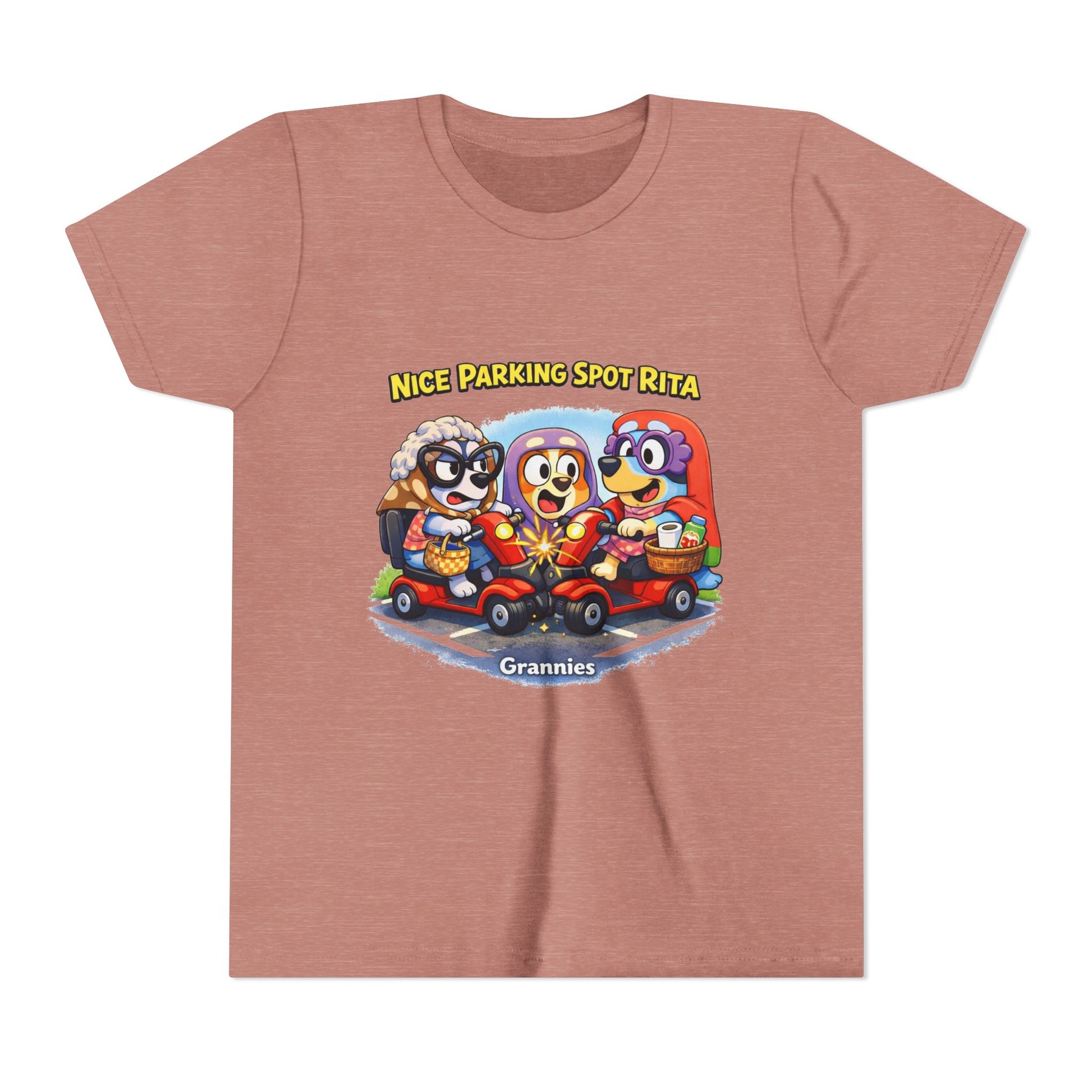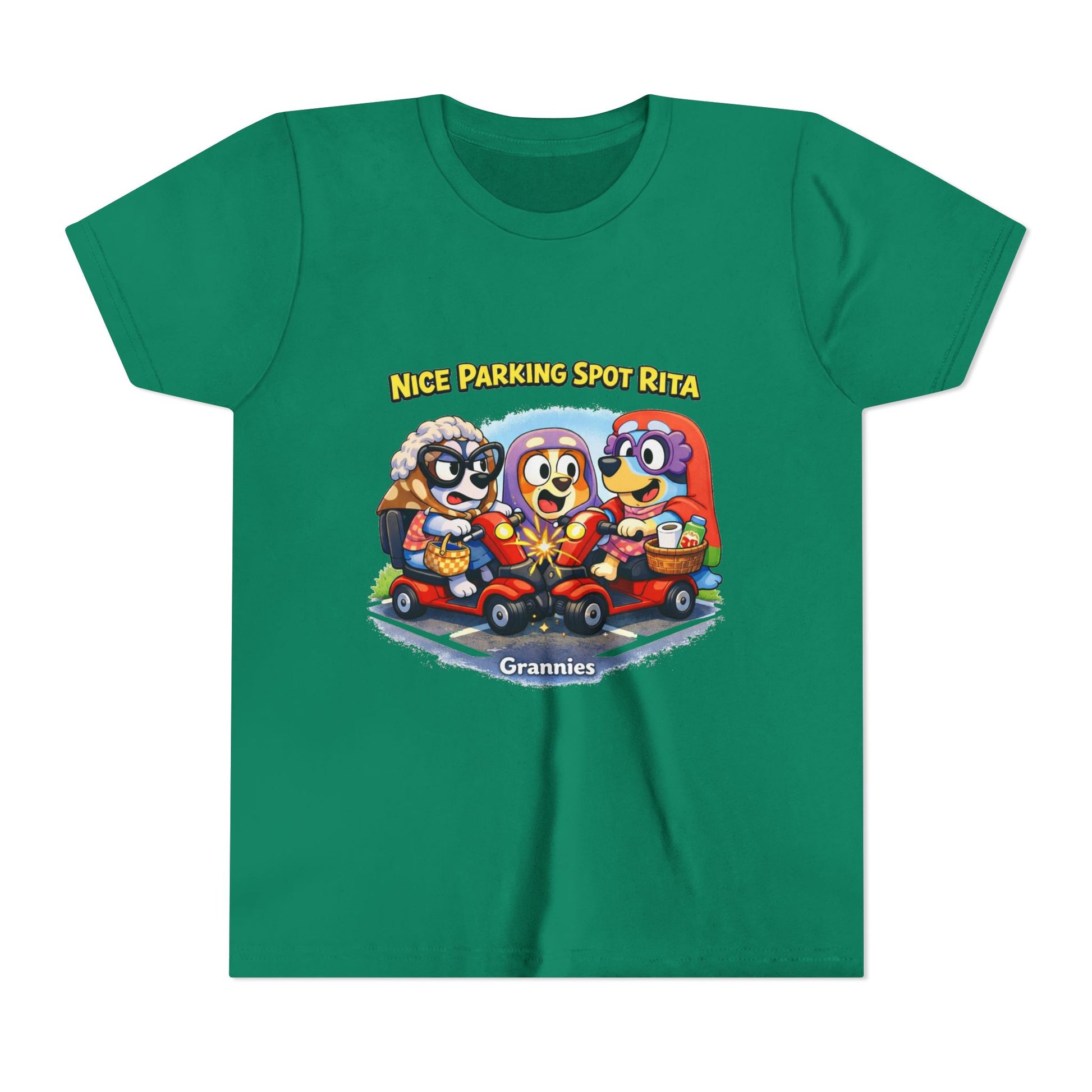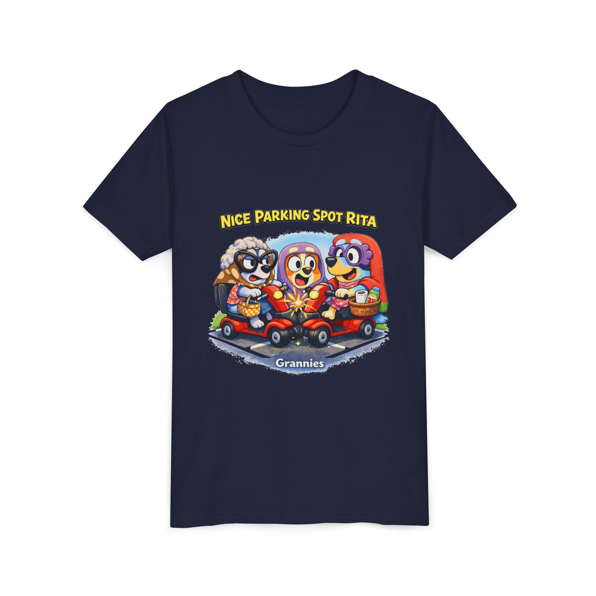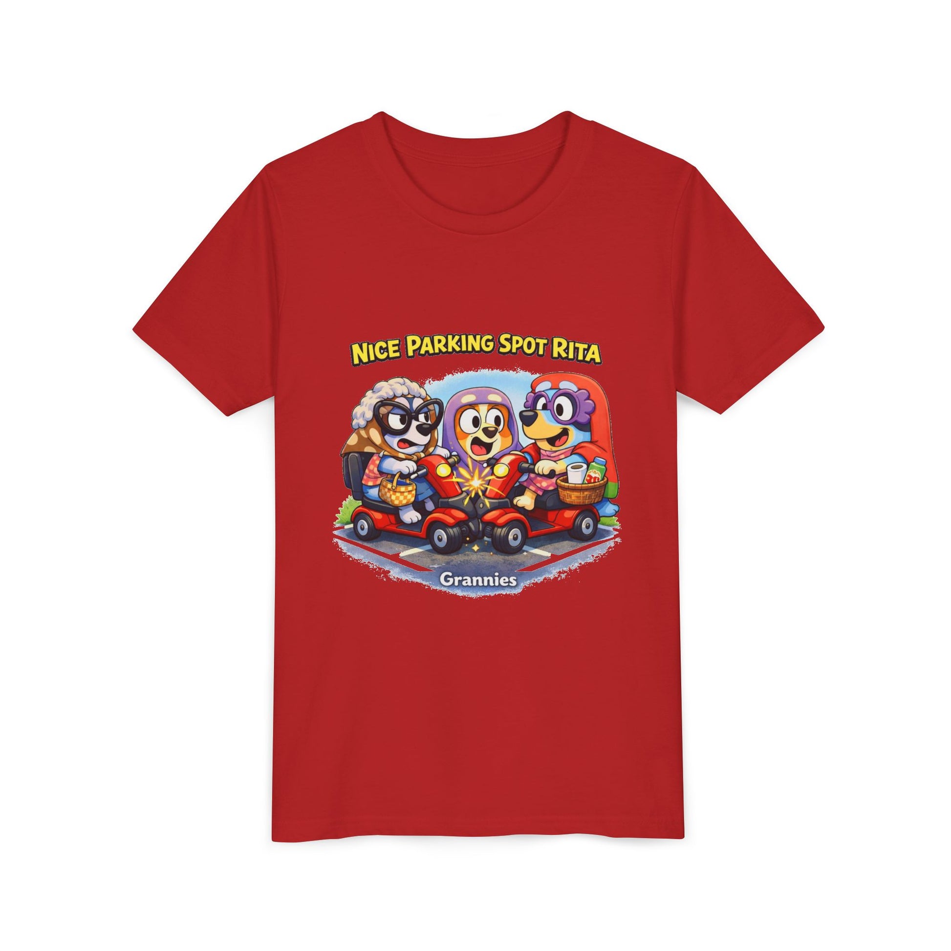 Bright, playful, and a little bit cheeky — this youth tee brings cartoon-style fun to everyday wear. A colorful illustration of three feisty grannies tooling around in mobility scooters is printed on a soft, lightweight crew shirt. The image pops with bold lines and warm colors, and the short sleeve silhouette keeps movement easy for active kids. Wear it to school, weekend outings, or family gatherings where a little humor and personality are welcome. Breathable fabric and a retail fit keep the tee comfortable during play, while the ribbed collar and side seams help it hold shape through washes. It’s a simple way for kids to show off a playful sense of humor and stand out with a vintage-inspired, comic vibe.